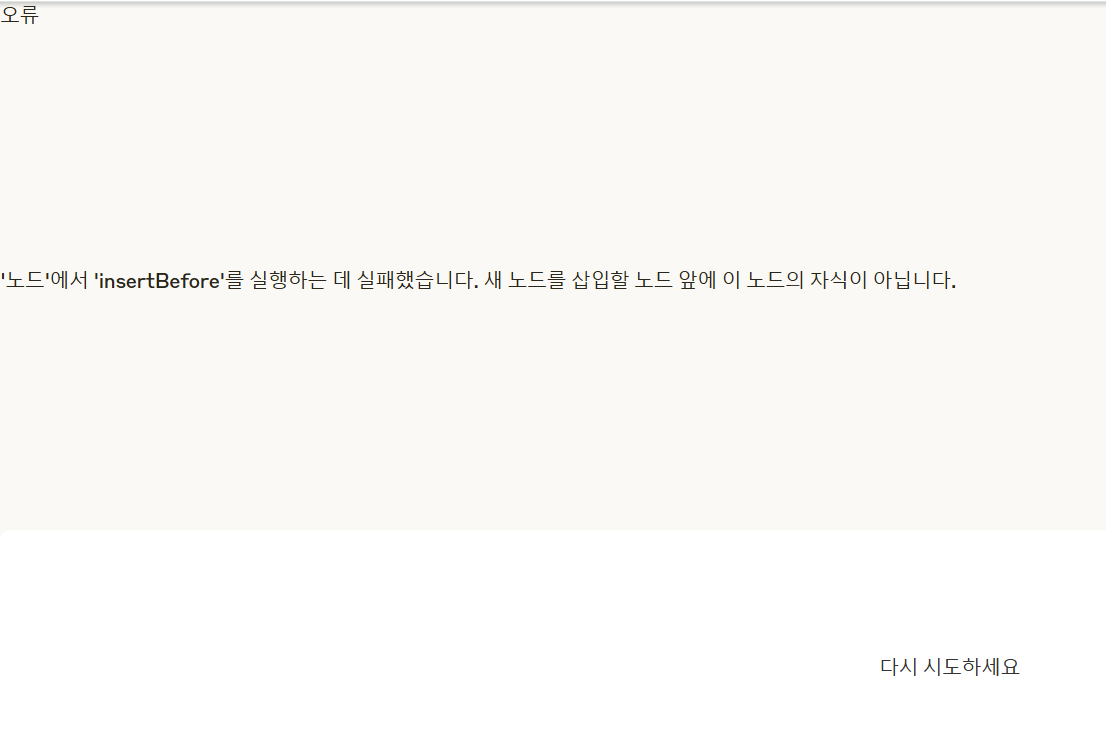 '노드'에서 '삽입 전'을 실행하지 못했습니다: 새 노드가 삽입되기 전의 노드는 이 노드의 자식 노드가 아닙니다.